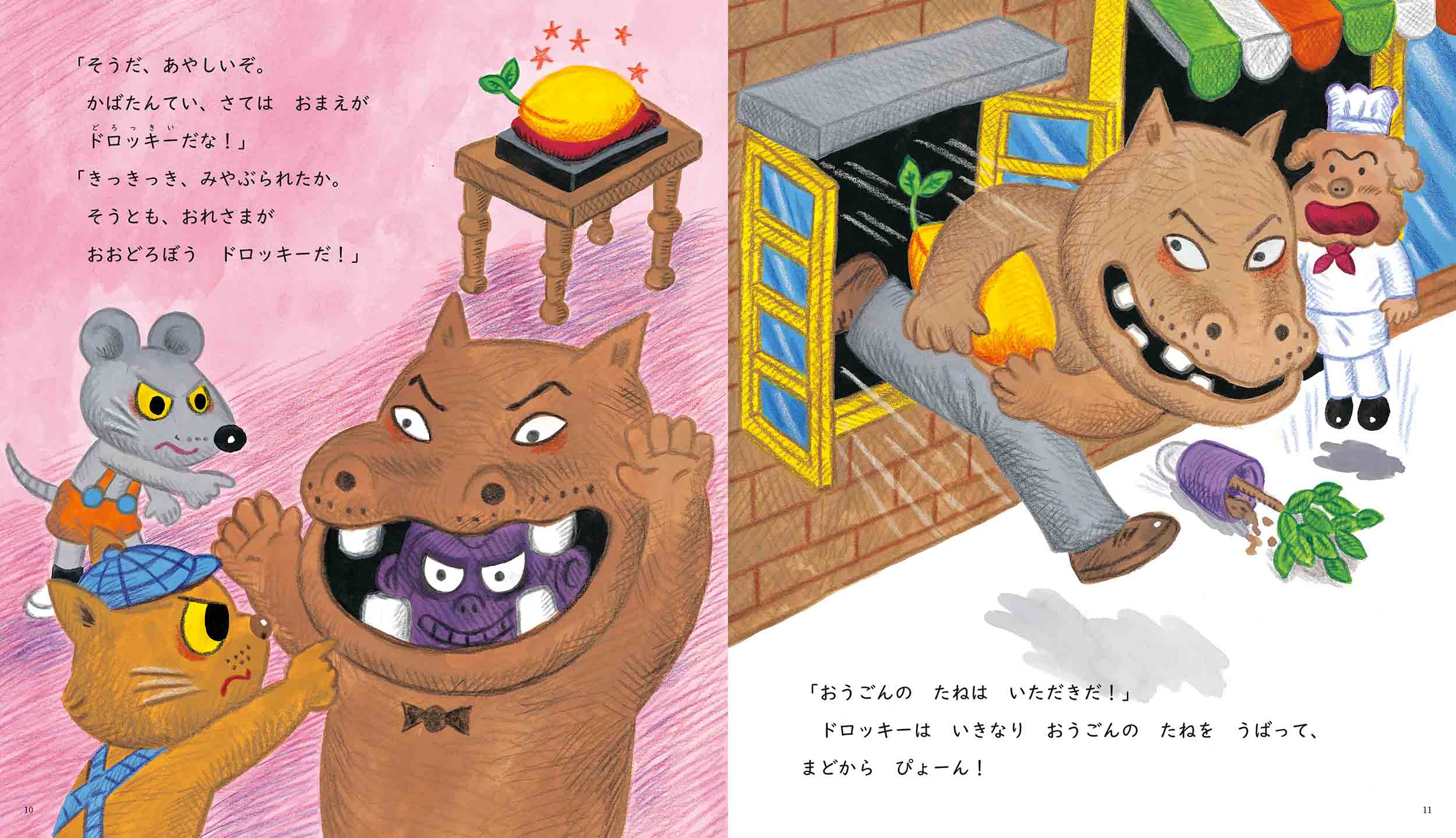 大泥棒ドロッキーをつかまえろ‼ごちそうに目がない名(迷?)探偵コンビが誕生♪食いしん坊の探偵ニャームスと助手マウスンのもとに、ある日、仕事の依頼が…。変装した大泥棒ドロッキーを見つけた二人ですが、あっさりと逃げられてしまいます。町中追いかけての大騒ぎ。さあ、二人は無事に「黄金の種」を取り戻せるのでしょうか?ラストシーンでは、ニャームスの意外な特技が炸裂!そして、黄金の種から生えてきたのは…?思わず笑ってしまう、ハラハラドキドキのおはなし絵本です。